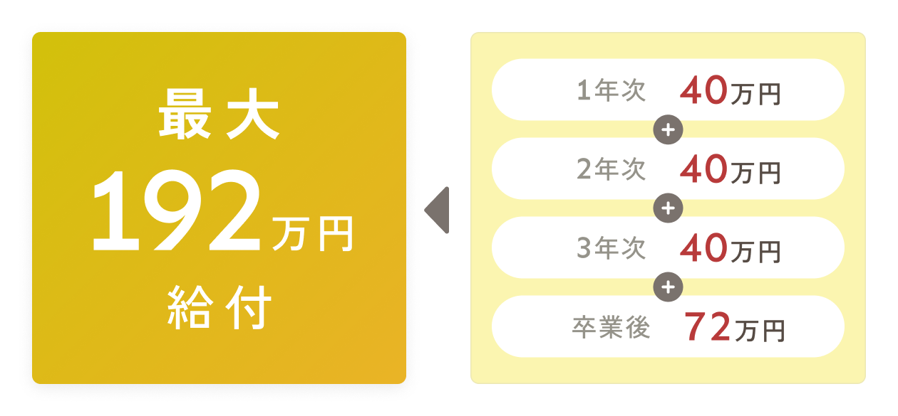 1年生40万円(10月頃)+2年生40万円+3年生40万円+卒業後72万円※