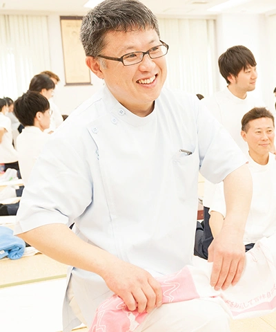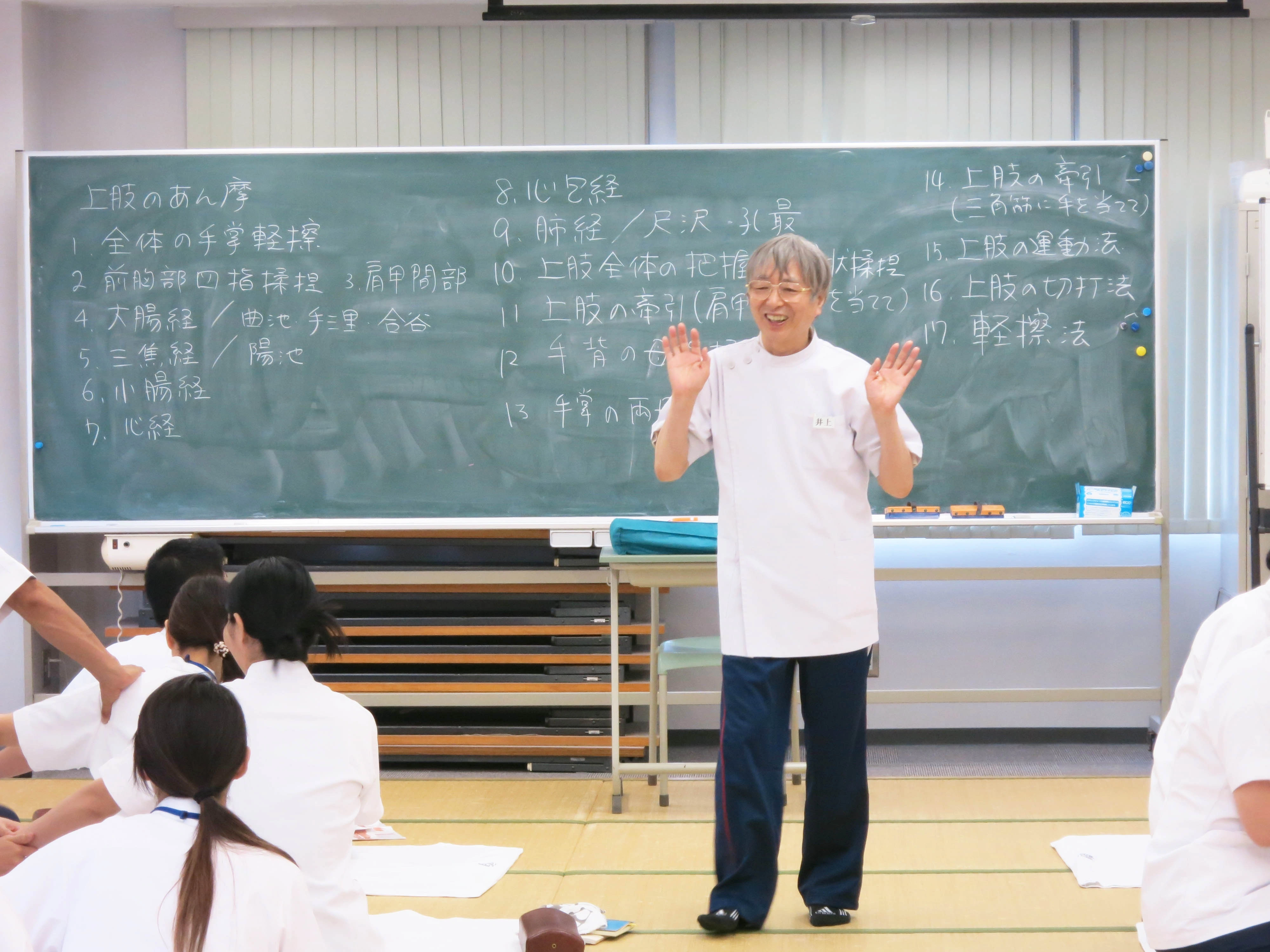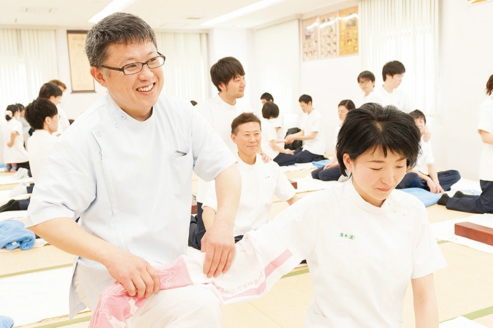 臨床経験50年を超える講師5名をはじめ、25名の講師が現役の治療家として活躍しており、現場での“リアルな技と感覚”をそのまま学べます。その中でも井上良太先生はトレーナー業界のパイオニア的存在であり、創業100年の歴史を持つ小守スポーツマッサージ療院代表を務めており、1年生・2年生を指導いただいています。また、大浦宏勝校長は伝統鍼灸の知識・技術を伝える第一人者であり、いやしの道協会第二代会長を務められていました。本校では2年生・3年生の鍼灸実技授業を担当し、学生にその経験と施術法を伝えています。