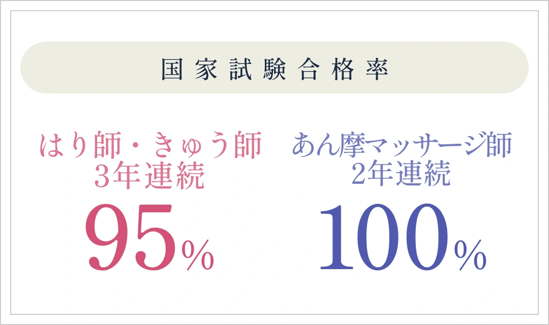 本校のはり師・きゅう師の合格率は3年連続95%以上、あん摩マッサージ指圧師は2年連続100%と高い合格率を誇ります。わからないところや不安な点はその場で解決できる対面式の学科授業、教員制作のオリジナルテキスト、過去問題10000以上掲載のアプリ、そして3年生では年間6回の模擬試験を行います。模擬試験の結果でグループ補習を行い、国家試験本番に備えます。