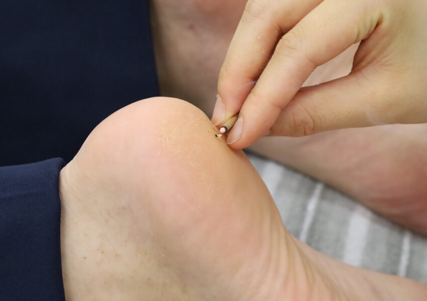 棒灸(棒状のお灸)で温めた枇杷の葉を皮膚に当てる療法で、