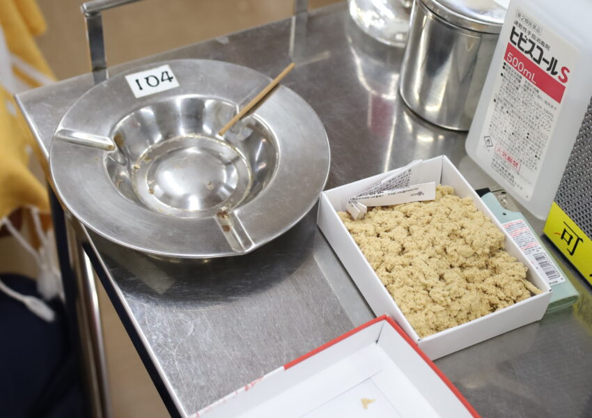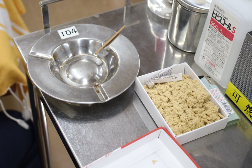 クラスメイトとおしゃべりをしながらの作業は楽しいものの、大量のヨモギが、作業を続けるうちにどんどん少なくなっていきます。最終的に、大きなすり鉢いっぱいのヨモギから、なんとかモグサらしく完成したものは……ほんの一掴み程度でした。