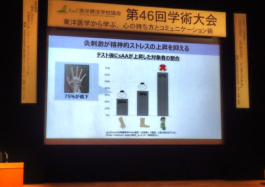 演題は『灸刺激による精神的ストレス緩和効果の検討-緩和ケアへの応用に向けて-』。実験を通じてお灸にストレス緩和効果があることを示しつつ、YMさんの「がん患者の精神的苦痛の緩和にお灸を役立てたい」という思いが研究発表に結実しました。当日の発表は、分かりやすく、かつ説得力ある説明ぶりで、会場からの質問にもあらかじめ準備していたスライドで難なく回答し、とてもカッコ良かったです。