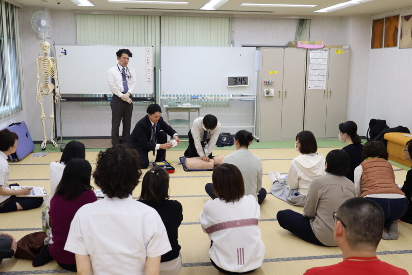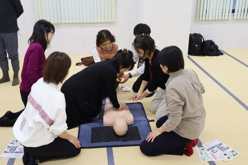 胸骨圧迫では強さや速さなど具体的なポイントを確認しながら行いました。